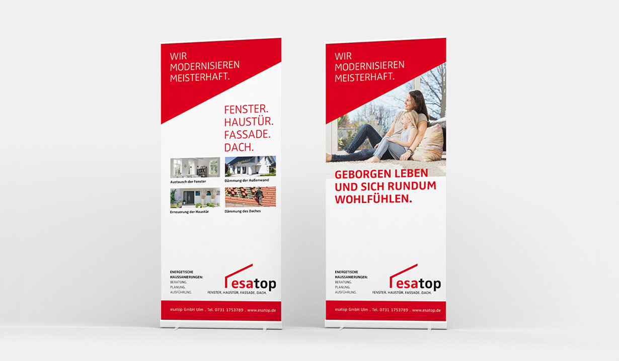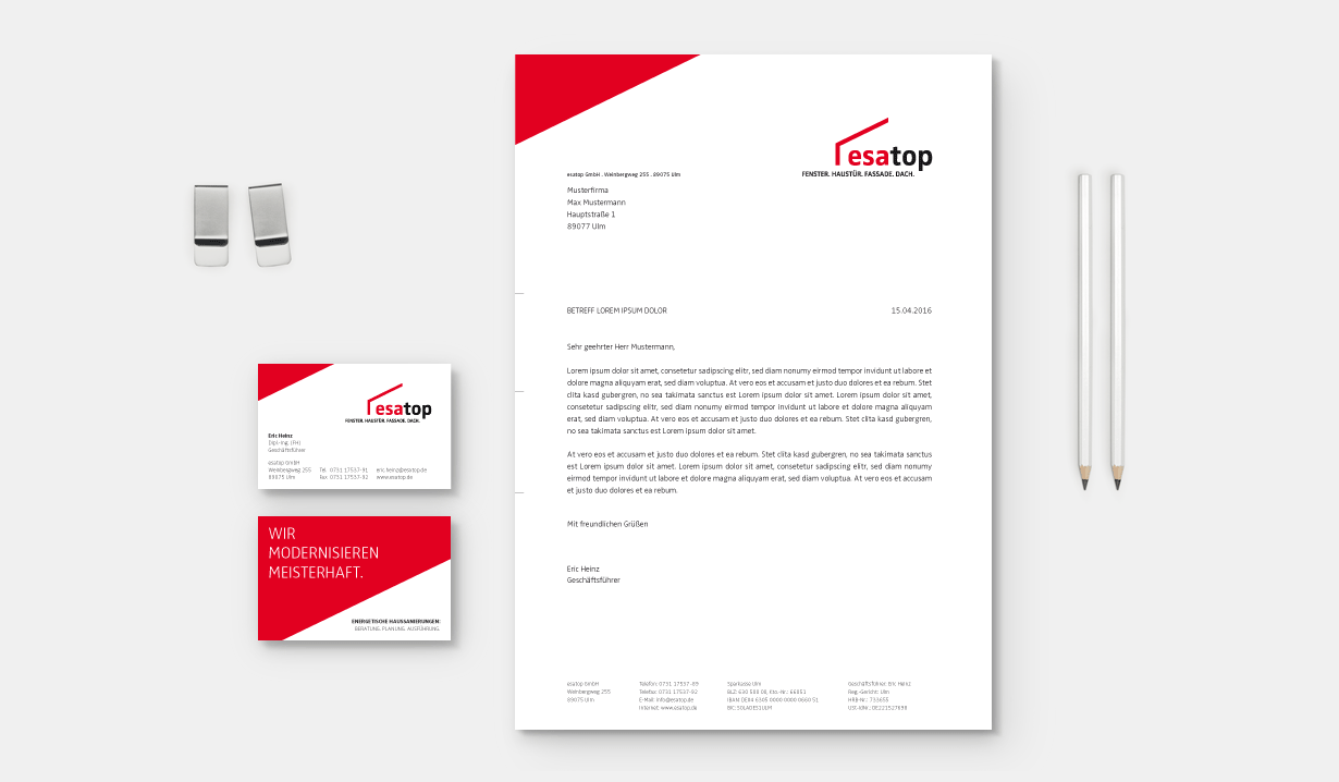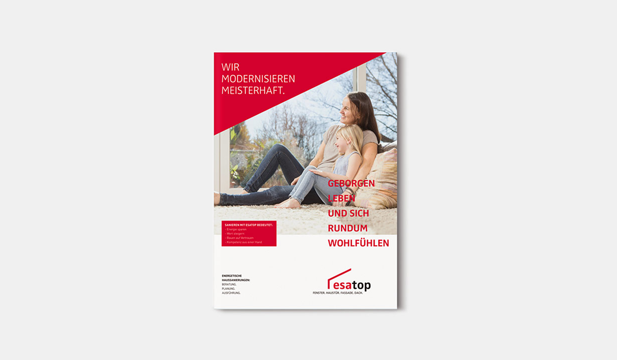 Corporate Design Die esatop GmbH steht für energetische Haussanierungen und hat sich dabei auf die komplette Gebäudehülle von Dach, Fassade, Tür und Fenster spezialisiert. Von der Planung bis zur Ausführung, alles aus einer Hand.
