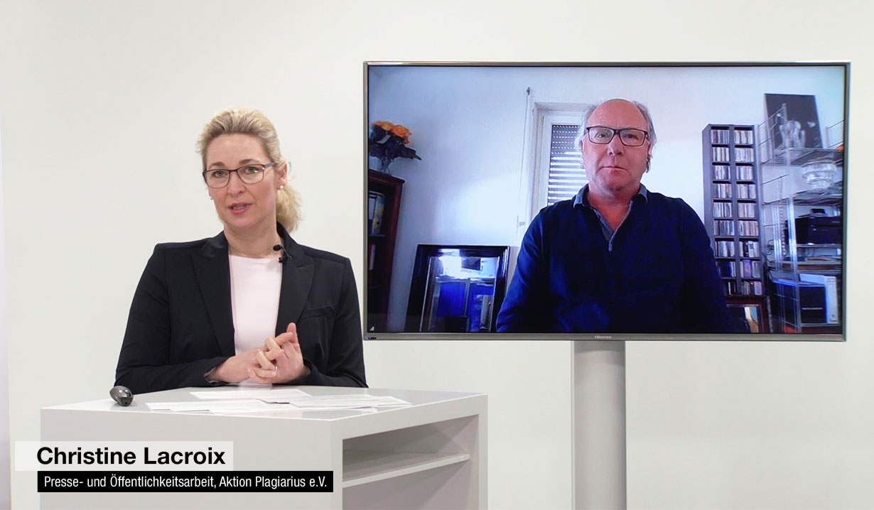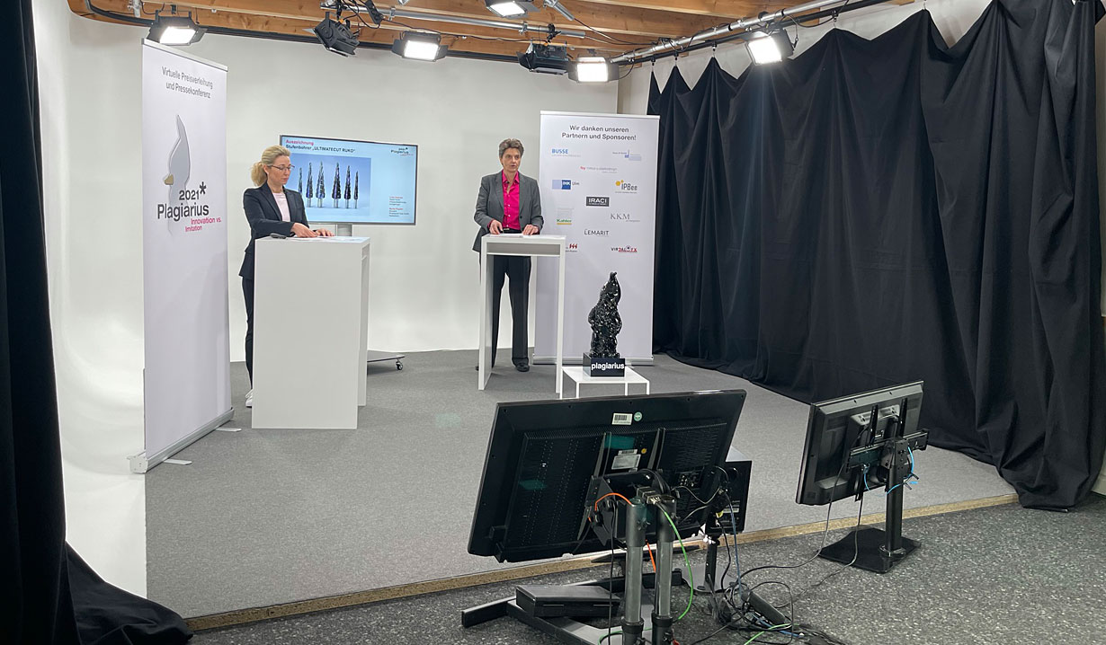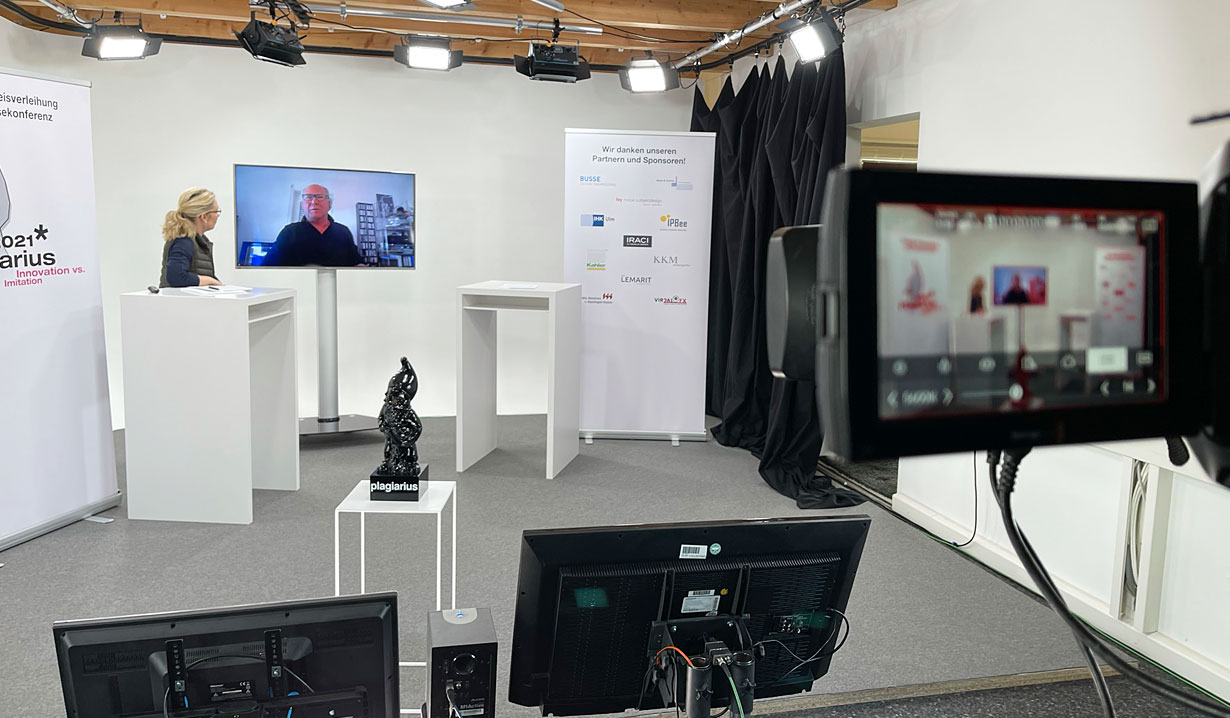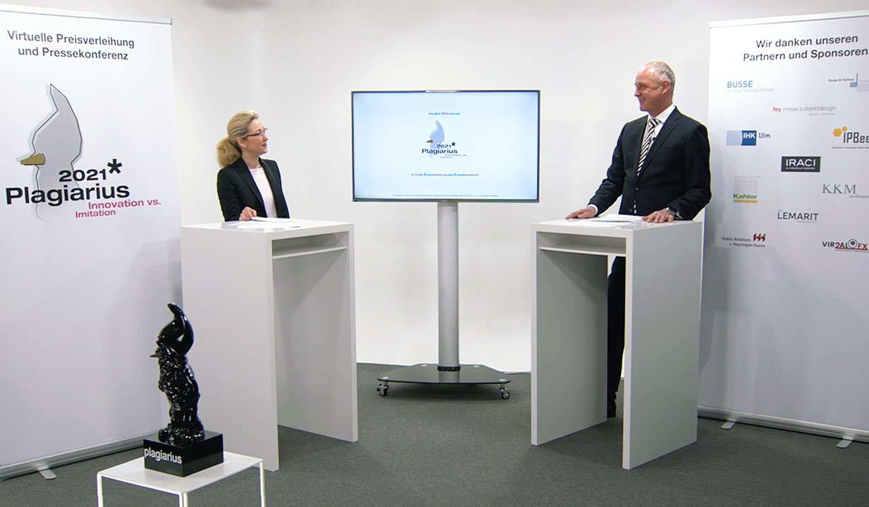Digitale Pressekonferenz Seit über 40 Jahren wird der Negativ-Preis "Plagiarius" für die dreistesten Plagiate und Fälschungen von der Aktion Plagiarius alljährlich auf der Ambiente, der weltgrößten Konsum­gütermesse in Frankfurt, verliehen. 2020 kam Corona und die Preise mussten erstmalig aus dem Studio heraus vergeben werden.